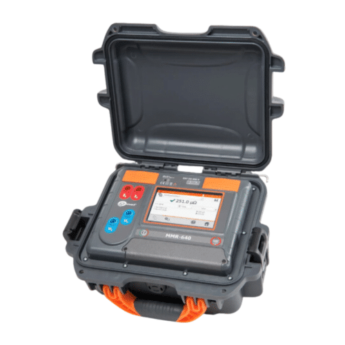 Designed to measure very low resistances of resistive types of objects. This product is made to be used in power plants, railways and maintenance companies, to measure welded and soldered connections, equipotential bondings, earthing conductors, contacts, bolted connections, windings of motors and power transformers and other resistive objects. MMR-640 can be also utilised on a production lines (eg. at the final production control stage). An innovative combination of a high-performance measuring device with a modern user interface and advanced data management system. Features: • Measurement of resistive loads • Rugged and weatherproof micro-ohmmeter • Resistance measurement from 0 to 2,000 ohms • Resolution 0.1 micro-ohms • Accuracy 0.25% • High noise immunity • 4-wire Kelvin probe measurement • Measuring voltage up to 10V • Limits and signalling set up • Li-ion Rechargeable battery • LCD Intuitive touch screen • IP67 • 600V CAT III • USB, WiFi, LAN